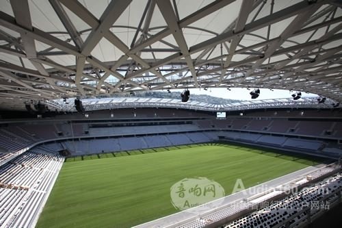 盡管遠離比賽區域,Electro-Voice揚聲器仍然能提供最優音質。35只ZX1i-100T揚聲器環繞覆蓋整個體育場及各個進出通道。在通道、更衣室和酒吧內,超過450只博世LC1-WM06E8吸頂式揚聲器和400只博世LP1-UC10 單向聲音發射器負責重放聲音。數字信號處理通過來自Electro-Voice的N8000 數字矩陣完成。該設備由配備RCM-810遙控組件的19臺 CPS 4.10 和15臺 CPS 8.5 功放提供驅動。在體育場的休息區, Electro-Voice設備為現場觀眾提供了舒適的環境。其中,提供的6塊PWS-4墻板讓用戶只需按下按鈕就可選擇不同聲源,例如移動CD播放器、無線麥克風和調音臺。