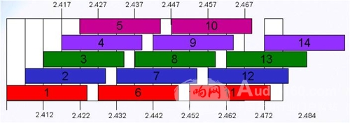 從圖中可以看出,2.4G頻道最多容許3個互不干擾的信道,就是1、6、11(12、13、14是歐、日標準,中國不支持)