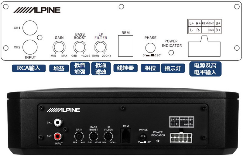 PWE-S800與過往同類型型號最大不同之處就是產品本體可以直接調節“增益”“低音增強”“低通濾波”和“相位”。這樣即使不安裝線控器也能調節使用。