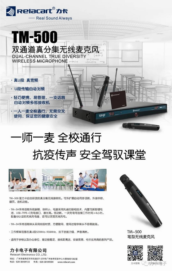 力卡電子作為國內(nèi)專業(yè)研發(fā)生產(chǎn)27年的無線有線音頻廠家,所開發(fā)出的TM-500雙通道真分集無線麥克風(fēng),不但功能穩(wěn)定、安裝簡易、性價比高,且擁有“真正實(shí)現(xiàn)頻率管理•無線分區(qū),一支麥克風(fēng)走遍多個課室”的技術(shù)亮點(diǎn),成為了校方打造專業(yè)教育系統(tǒng)的不二選擇。