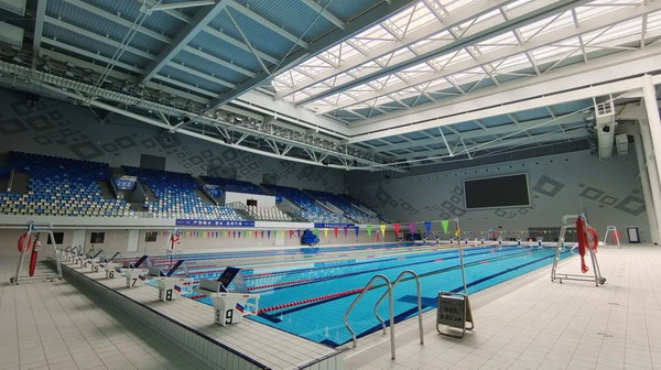 清遠奧體中心游泳館分為地下一層,地上三層,可容納2000人觀賽。游泳館比賽池上空采用大跨度可開合活動屋蓋,開合跨度寬達24米,能在5分鐘內實現室內與露天泳池的切換,是一種新型的可變形態建筑。