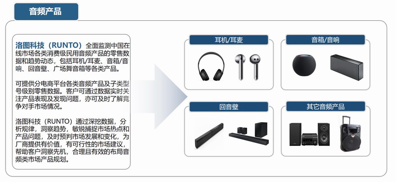 RUNTO全面監測中國各類消費級民用音頻產品零售市場。范圍包含耳機/耳麥、音箱/音響、回音壁、廣場舞音箱等各類產品。其中耳機/耳麥按產品類型分為有線入耳耳機、真無線(TWS)耳機、頭戴式耳麥和頸掛式耳機;音箱/音響分為傳統音箱和智能音箱。