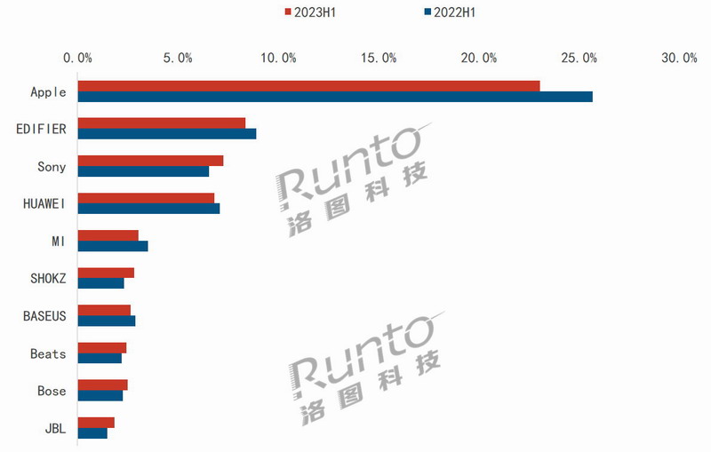 在中國耳機耳麥線上市場,TOP10品牌中,國產和外資各占一半。根據RUNTO線上監測數據顯示,蘋果依舊保持市場第一的位置,但新品Airpods Pro第二代和Airpods 3帶來的增量并未能完全填補老舊型號的下跌空間。2023年上半年,蘋果市場份額下降至23%,和2022年同期相比,減少了2.6個百分點。