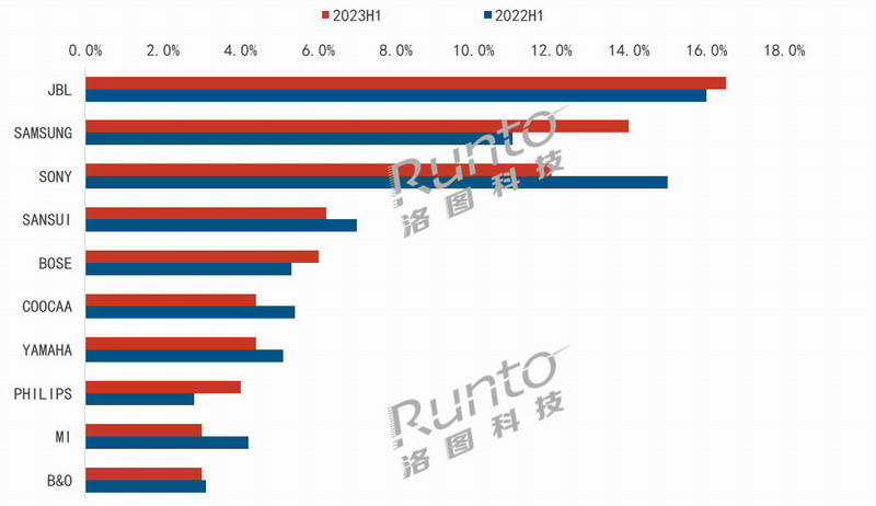 Soundbar市場中,JBL、三星通過不斷地產品升級迭代和價格優勢,正在搶占Sony市場份額。根據RUNTO線上監測數據,JBL以16.5%的銷額市占率排名第一。