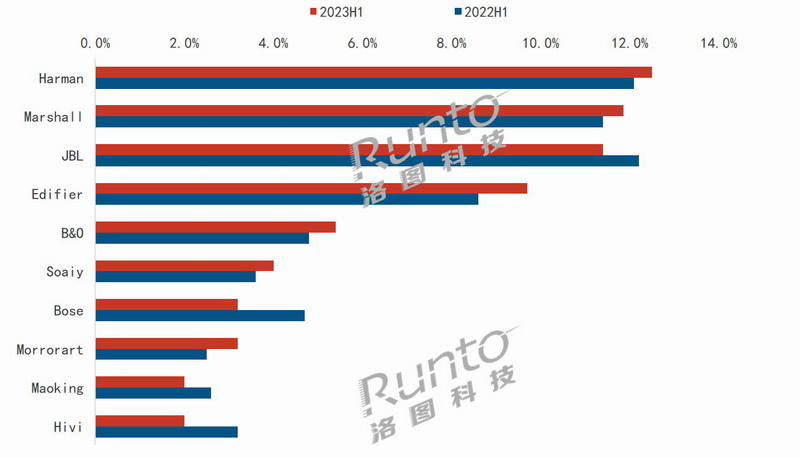 傳統音箱市場中,外資品牌占據一定主導地位。TOP5品牌中有4家為外資品牌,其中哈曼卡頓集團旗下Harman-Kardon和JBL依靠獨特新穎的外觀造型設計,長期保持市場領先地位。根據RUNTO線上監測數據,2023年上半年,Harman以12.5%的份額位列整體市場的銷額第一名,JBL以11.4%的份額位列第三。