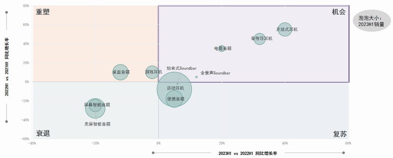 亮點:骨傳導耳機、開放式耳機、電競音箱、全景聲Soundbar位于機會象限