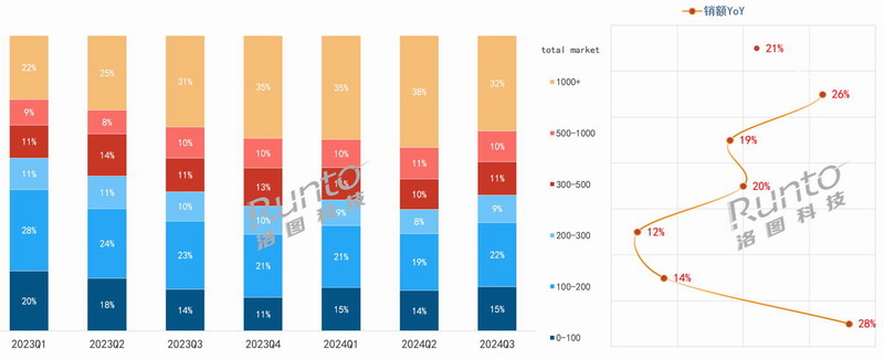 根據(jù)洛圖科技(RUNTO)線上監(jiān)測數(shù)據(jù)顯示,2024年第三季度,1000元以上價(jià)格段在線上傳統(tǒng)市場的份額較去年同期增長了1個(gè)百分點(diǎn)。在蘋果、BOSE的新品強(qiáng)拉動(dòng)下,該價(jià)格段銷量同比增長達(dá)36.1%,銷額同比增長26.0%。