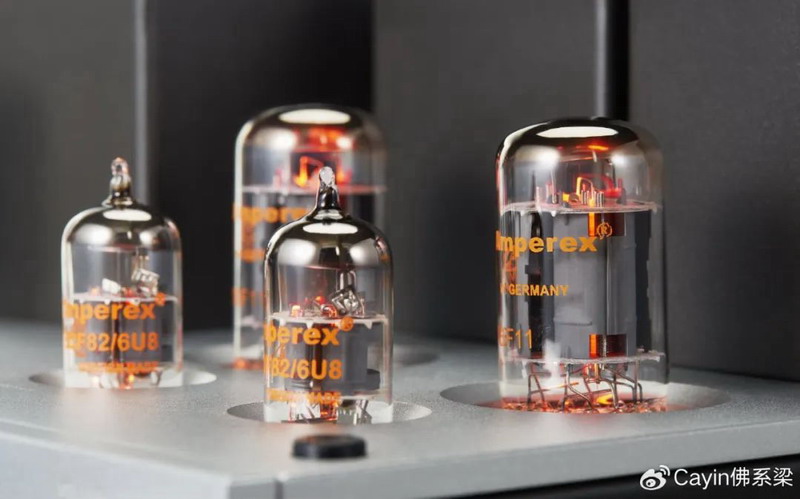 HA-2A與其他HA系列不同的地方在于,她是Cayin首款全部采用古董管NOS(NEW OLD STOCK即全新未使用過的庫存古董管)設計的電子管耳放。整機一共五支電子管,其中RCA 17AX4GT作為膽整流,負責前級電子管的屏極供電,充分發揮電子管整流獨有的諧波豐富和溫暖細膩的音色聽感。而前級和功率管均采用著名的“吹喇叭”電子管,前級管和功率管分別是兩支Amperex ECF82/6U8 和Amperex 17BF11,并經過嚴格檢測配對組成。