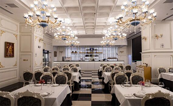 挑高6米的穹頂下,巴洛克浮雕與洛可可鎏金裝飾交織,暖金色燈光透過水晶吊燈灑落,現磨咖啡的香氣與小提琴的悠揚旋律縈繞——這里不僅是味覺的殿堂,更是一場五感聯動的藝術盛宴。